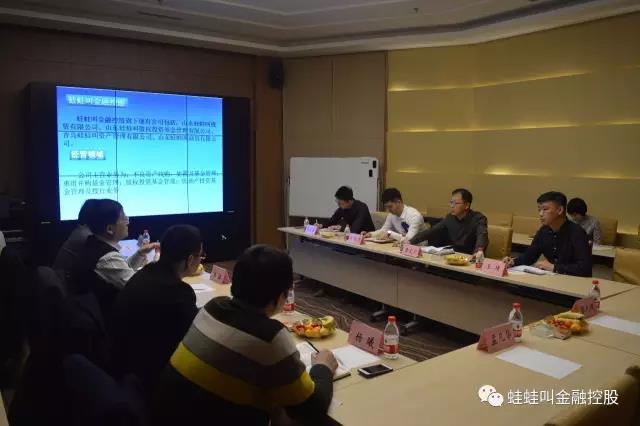 董事长李文广就蛙蛙叫金融控股历史沿革、经营状况、业务模式、业务亮点及战略规划等公司基本情况向客人做了认真介绍,尤其在不良资产管理、基金管理等方面的实践经验和心得体会方面做了重点分享,双方还围绕不良资产投资、股权投资及房地产投资合作模式创新、产品发行渠道定位、风险控制及财务核算与规划等方面进行了深入探讨,双方表达了未来加强业务合作及项目落地的强烈意愿。 总经理王琦、董事赵海涛、运营总监李文颖参加座谈。