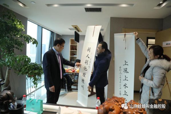 期间,原人民银行济南分行巡视员祖洪涛先生特地委人送来亲题书画作品作为本次乔迁典礼的一份特别贺礼送给山东蛙蛙叫金融控股,深情厚谊地赋语:上风上水上上德,利人利他蛙蛙叫;可谓价高评重!这给予了蛙蛙叫人极大的鼓舞和无比的信心,也交相辉映了蛙蛙叫企业口号“有力量,更有情怀!”的深涵境意!